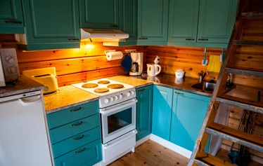 Mökistä löytyy takka, jonka loimutessa on mukava rentoutua ulkona vietetyn päivän jälkeen.