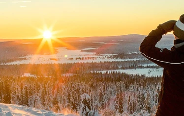 Muoniossa ei upeampaa paikkaa ole kuin Pallastunturi. Pallaksen keroilta on uskomattomat maisemat ja koko paikka on talvinen ihmemaa. Tunturin juurella laitamme lumikengät jalkaan ja suuntaamme läheiselle kodalle. Tänne jätämme painavimmat varusteet ja jos mukana on lapsia tai vanhuksia, joille tunturiin nouseminen on liian rankkaa, niin kotaan voi jäädä lämmittelemään. Tästä nousemme puurajan yläpuolelle, josta avautuvat henkeäsalpaavat maisemat. Nousemme niin korkealle kuin ryhmän toive on, vaikka ihan huipulle asti jos keli sen sallii. Lopuksi palaamme takaisin kodalle ja valmistamme maittavan lounaan tulen ääressä. Ennen lähtöä voimme niin halutessasi vielä vierailla Pallaksen luontokeskuksella sen aukioloaikojen puitteissa.